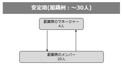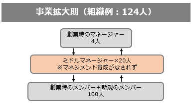 事業拡大に対応するための階層構造型マネジメント下における拡大は、 新任管理職が急増することになり、現場の生々しい情報収集が難しく、組織の上意下達が進まず。